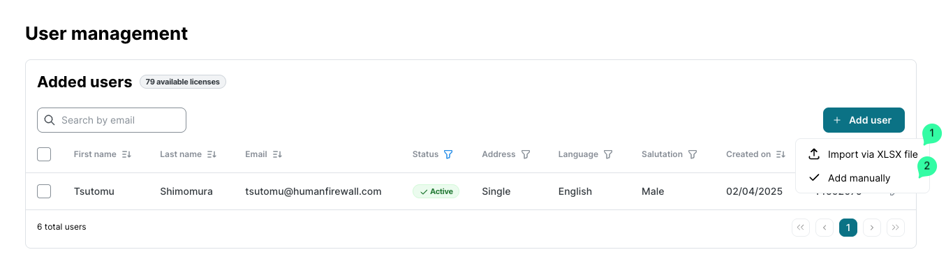 Nach einem Import via XLSX-Datei können Sie auf + Nutzer hinzufügen klicken, um neue Nutzer manuell hinzuzufügen.
