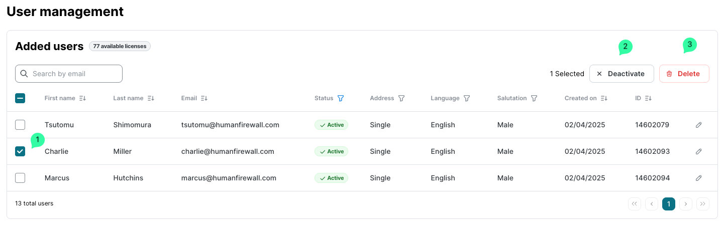 Um Nutzer zu aktivieren, klicken Sie auf das Kontrollkästchen oben links (1), um alle Nutzer auszuwählen oder klicken Sie auf das Kontrollkästchen jedes Nutzers und dann auf Aktivieren.